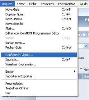 1º Passo: Com o Internet Explorer aberto, clicar no menu Arquivo, e depois em Configurar Página: